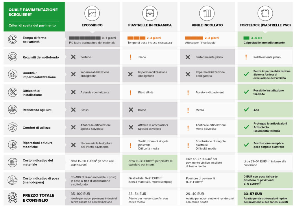La scelta del pavimento non riguarda solo l’aspetto o il prezzo al metro quadrato. Nella pratica, sono fattori completamente diversi a fare la differenza: quanto durerà nel tempo, quanto è complessa l’installazione, cosa succede in caso di danni e quanto vi costerà nel lungo periodo.